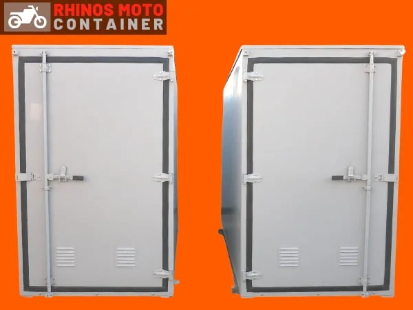 バイクガレージ用コンテナ『ライノス モトコン』には幅が1250mmのスタンダードタイプと1350mmのワイドタイプがございます。また、ドアは右ヒンジ(左から右へ開くドア)と左ヒンジ(右から左へ開くドア)をご選択頂けます。